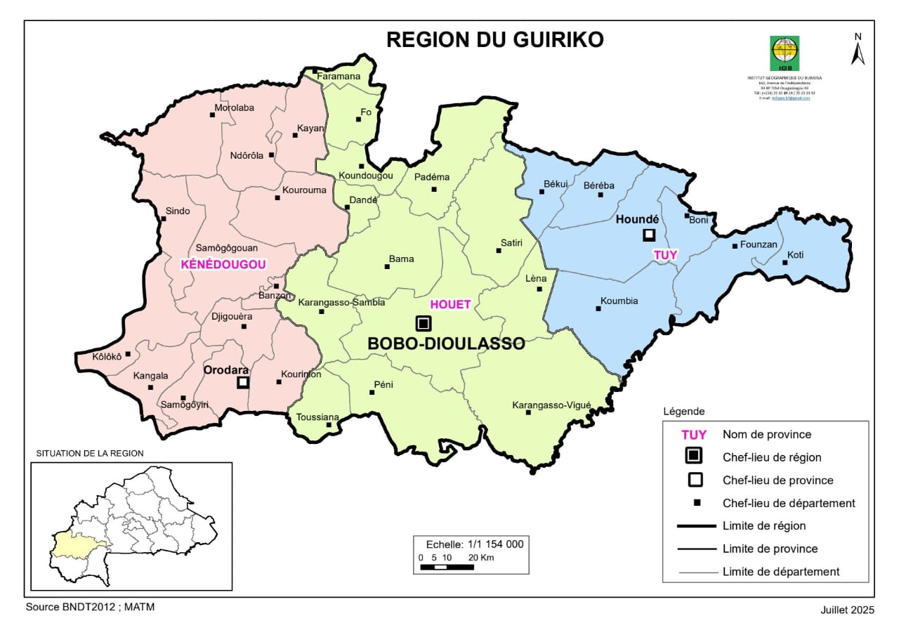 La région du Guriko est subdivisée en trois (03) provinces (Houet, Kénédougou et Tuy) et trente-trois (33) communes dont trois (3) communes urbaines et une commune à statut particulier qui est le Chef-lieu de la région (Bobo Dioulasso). Elle compte quatre cent soixante-dix-neuf (479) villages (selon le RGPH 2019).